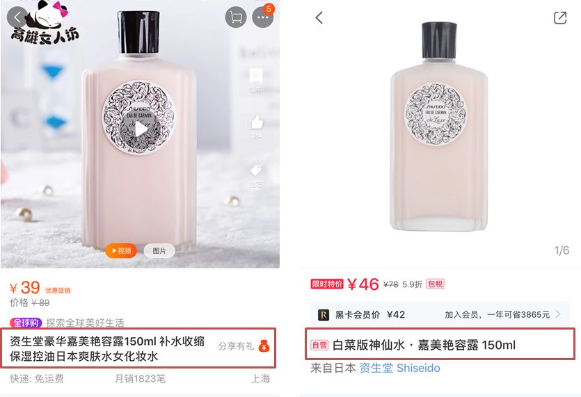 左边是来自淘宝全球购的文案,全是关键词的罗列,一坨文字粘在一起,目的是让消费者在搜索“控油、保湿、日本爽肤水、化妆水”这些词汇时,能让商品碰巧出现在搜索结果页上。