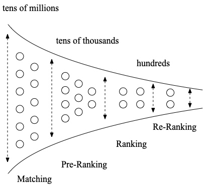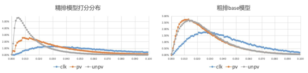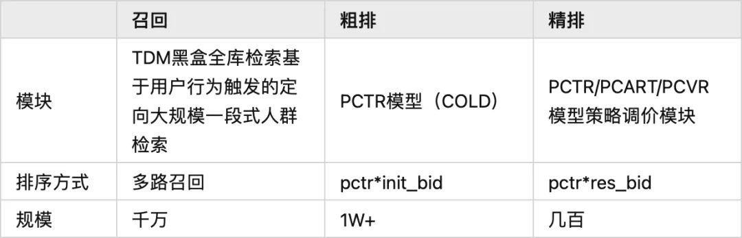 粗排:按照 ecpm=pctr*init_bid 的方式进行排序,粗排使用的是广告主的原始 bid,但是精排会基于多目标模型打分(点击率/收藏加购率/成交率模型)以及策略调价模块(基于广告主和平台诉求对广告出价进行调整)对广告主出价进行调整,因为在 bid 上和精排存在 gap,同时粗排在 pctr 模型能力上和精排也存在差距。