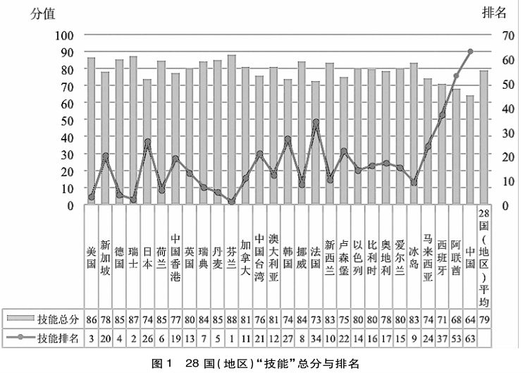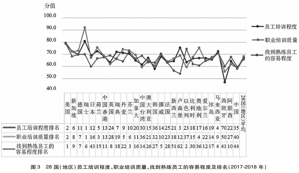 与其他指标相比,员工培训程度、职业培训质量、找到熟练员工的容易程度整体表现欠佳,28国(地区)三项指标平均值均低于70分,表明大多数国家(除瑞士、美国外)对劳动力的再教育和再培训相对缺乏,毕业生技能难以满足企业需求,教育与市场需求存在一定程度脱节。而我国这三项指标的得分均低于60分,与大多数国家差距较大,表明在这三方面面临更大挑战。