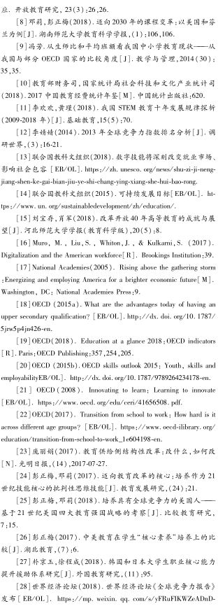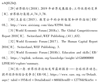 世界经济论坛指出,“技能”支柱反映劳动力技能的总体水平及教育的数量和质量。如今评价教育质量的重要因素包括:发展数字素养、人际交往技能以及批判性思维和创造性思维能力(WEF,2018a)。值得注意的是,世界经济论坛提到的技能和能力正是世界各国兴起的21世纪技能教育改革运动中所重视的关键能力(邓莉等,2017a)。