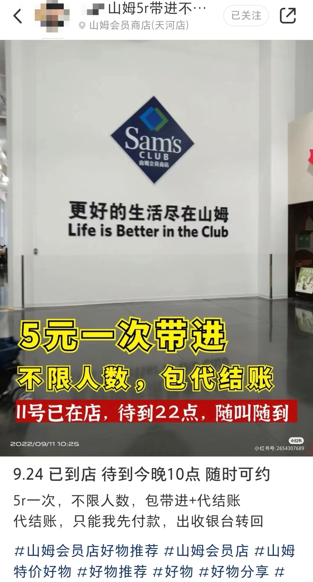 ▲ 小红书上的“5元一次带进山姆”帖子。图 / 手机截图