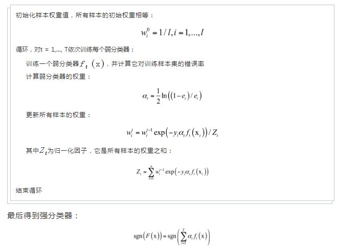 被上一个弱分类器错误分类的样本权重会增大,正确分类的样本权重减小,训练下一个弱分类器时算法会关注在上一轮中被错分的样本。这对应于每个医生在学习之后对病例权重的调整。给样本加权重是有必要的,如果样本没有权重,每个弱分类器的训练样本是相同的,训练出来的弱分类器也是一样的,这样训练多个弱分类器没有意义。AdaBoost算法的原则是: