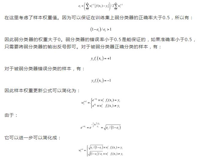根据计算公式,错误率低的弱分类器权重大,它是准确率的增函数。沿用医生集体会诊的例子,如果在之前的诊断中医生的技术更好,对病人情况的判断更准确,那么可以加大他在此次会诊时说话的分量即权重。弱分类器在训练样本集上的错误率计算公式为: