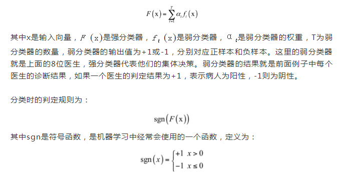 强分类器的输出值也为+1或-1,同样对应于正样本和负样本,也就是医生集体会诊的结果。这里的强分类器模型就是这就是上面的诊断规则的抽象化。弱分类器和它们的权重通过训练算法得到,后面我们会介绍。之所以叫弱分类器,是因为它们的精度不用太高,对于二分类问题,只要保证准确率大于0.5即可,即比随机猜测强,随机猜测也有50%的准确率。在上面的例子中,即使每个医生的准确率只有60%-75%,集体决策的准确率仍然能够达到95%以上。这种看似简单的组合,能够带来算法精度上的大幅度提升。
