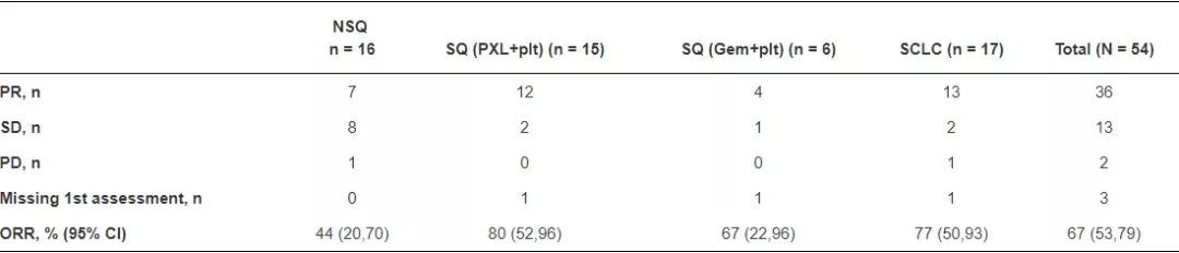 截止2018年10月15日,54例患者中仍有24例在接受治疗。36例患者疗效评价为部分缓解,所有患者的客观缓解率为67%,无进展生存(PFS)数据尚未成熟。研究表明替雷利珠单抗联合含铂化疗方案治疗晚期肺癌患者耐受性良好,显示出抗肿瘤活性(临床试验信息:NCT03432598)。
