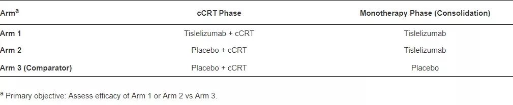 在这项3臂的研究中,计划约840例患者将按1∶1∶1随机分配,第1组在给予替雷利珠单抗+同步放化疗后继续予替雷利珠单抗巩固治疗;第2组给予安慰剂+同步放化疗,后续使用替雷利珠单抗巩固治疗;第3组给予安慰剂+同步放化疗,后续继续安慰剂对照。对靶病灶放疗的剂量为60Gy(2Gy/30F),化疗方案包括依托泊苷+顺铂和紫杉醇+卡铂。研究主要终点为无进展生存(PFS),次要终点包括客观缓解率(ORR)、总生存期(OS),2年生存率和安全性。临床试验信息:NCT03745222。
