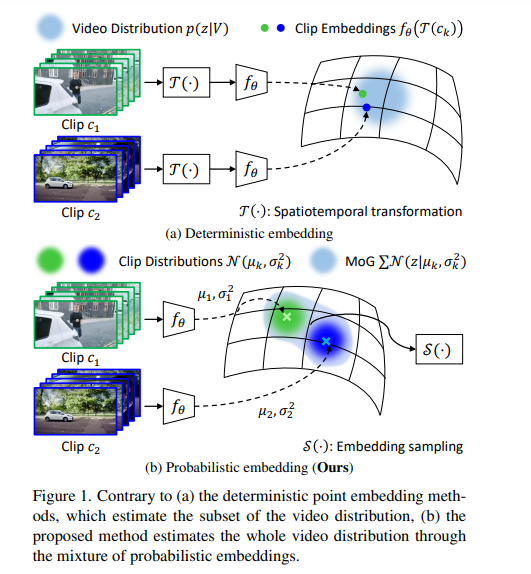 。我们假设构成视频的片段在短期内有不同的分布,但可以通过组合在一个共同的嵌入空间中来表示复杂和复杂的视频分布。因此,该方法将视频片段表示为正态分布,并将它们组合成混合高斯分布来建模整个视频分布。通过从整个视频分布中进行采样嵌入,我们可以绕过仔细的采样策略或转换来生成视频片段的增强视图,而不像以前的确定性方法主要关注对比学习中的这种样本生成策略。我们进一步提出了一种随机对比损失来学习合适的视频分布和处理原始视频的固有不确定性。实验结果证明,在UCF101和HMDB51等最流行的基准上,我们的概率嵌入是一种最先进的视频表示学习,用于动作识别和视频检索。