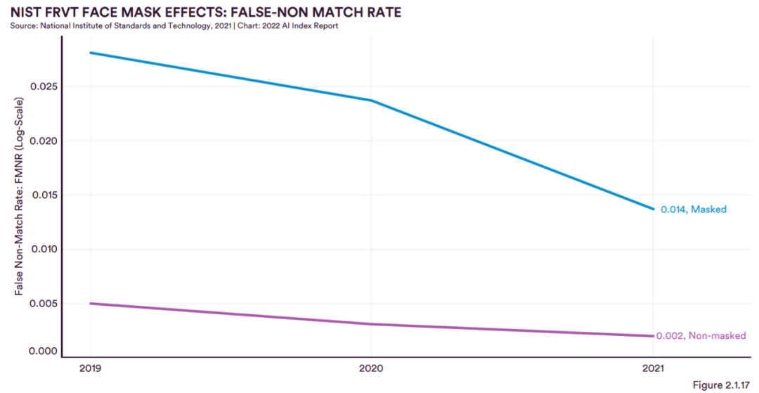 人脸检测:从 FRVT face-mask 测试中可以得出三个重要趋势:(1)面部识别系统在 masked 上的表现仍然相对较好;(2) masked 的表现比 non-masked 差;(3) 2019 年以来差距缩小。尽管人脸识别技术已经存在了几十年,但最近几年的技术进步是显著的。当今一些表现最好的面部识别算法在具有挑战性的数据集上的成功率接近 100%。