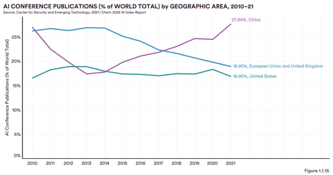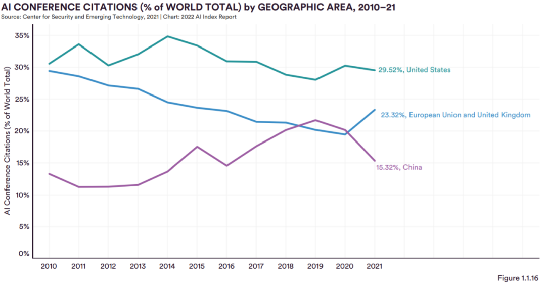 引用次数:尽管中国在 2021 年发表了最多的 AI 会议出版物,图 1.1.16 显示,美国在 AI 会议引用次数方面领先于其他大国,2021 年为 29.5%,其次是欧盟 + 英国 (23.3%) 和中国(15.3%)。