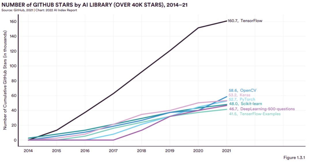 图 1.3.1 和 1.3.2 反映了 2015 年至 2021 年 GitHub 开源 AI 软件库的用户数量。TensorFlow 仍然是 2021 年迄今为止最受欢迎的,GitHub 累计 star 量约为 161,000 ,比 2020 年略有增加。TensorFlow 在 2021 年,它的受欢迎程度大约是排名第二的 GitHub 开源 AI 软件库 OpenCV 的三倍,紧随其后的是 Keras、PyTorch 和 Scikit-learn。图 1.3.2 显示了 GitHub star 量少于 40,000 的库的受欢迎程度—— FaceSwap 位居榜首,其次是 100-Days-Of-ML-Code、AiLearning 和 BVLC/caffe。