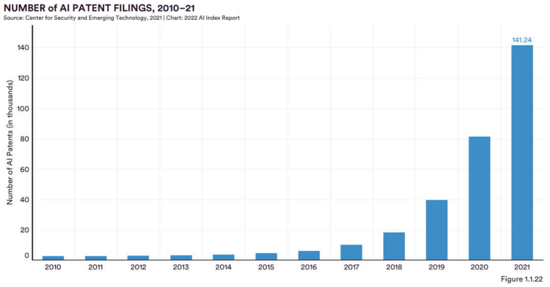 图 1.1.22 为 2010 年到 2021 年 AI 专利申请数量。2021 年 AI 专利申请量是 2015 年的 30 倍以上,复合年增长率为 76.9%。