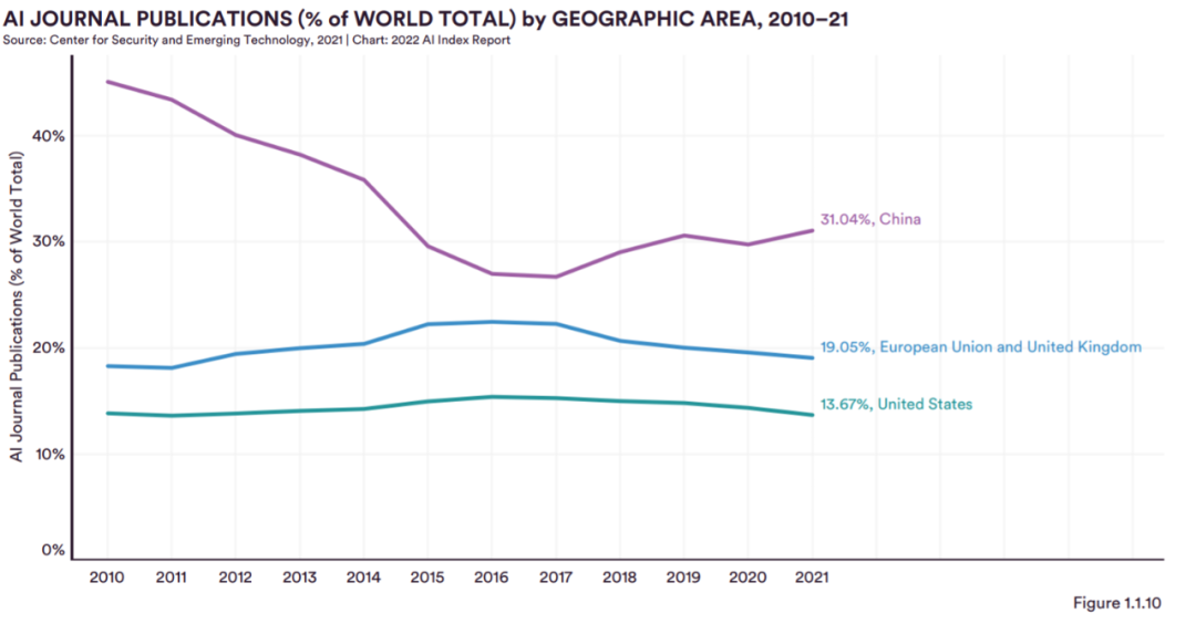 图 1.1.10 按三大 AI 强国划分了过去 12 年 AI 期刊出版物的份额。中国始终保持领先地位,2021 年为 31.0%,其次是欧盟和英国为 19.1%,美国为 13.7%。