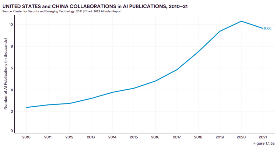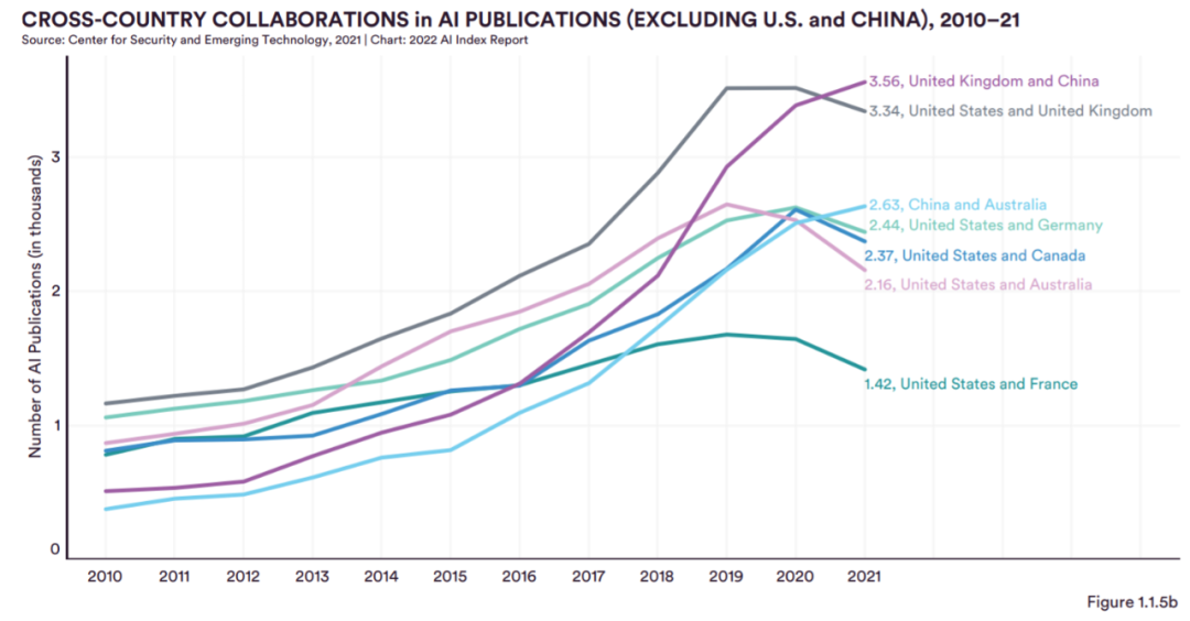 跨国合作:从 2010 年到 2021 年,中美在 AI 出版物方面的跨国合作数量最多,自 2010 年以来增加了五倍。两国之间合作产生的出版物数量是中英合作产生出版物数量的 2.7 倍(排名第二)。