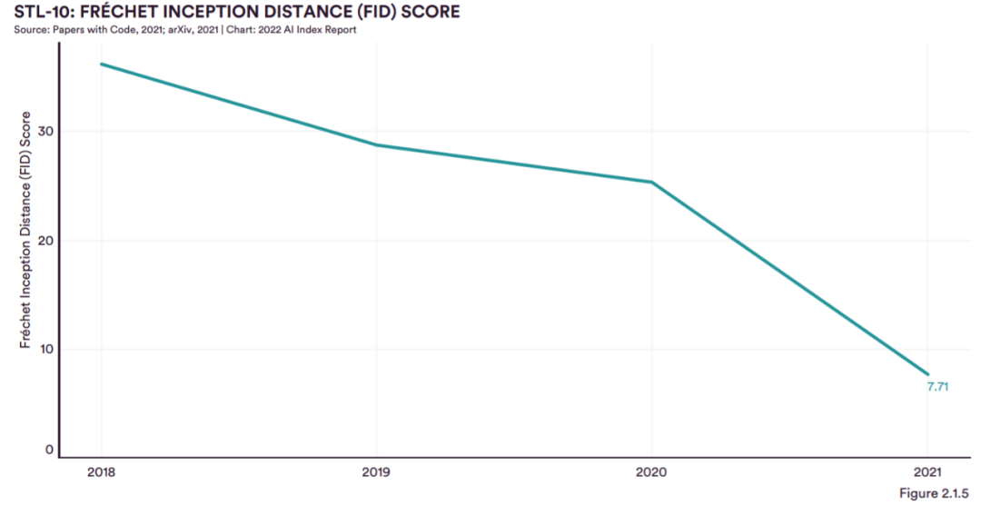 图 2.1.5 记录了生成模型在 STL-10 数据集上取得的性能。由首尔大学等机构的研究人员开发的最先进的 STL-10 模型的 FID 得分为 7.7,明显优于 2020 年 SOTA 结果。