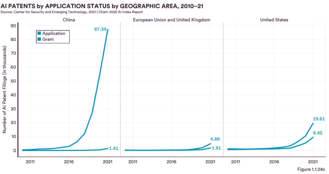 按地理区域:中国现在申请了全球一半以上的人工智能专利,并获得了约 6% 的授权,与欧盟和英国大致相同。美国在北美申请了几乎所有专利。图 1.1.24c 显示,与不断增长的人工智能专利申请和授权数量相比,中国的专利申请数量(2021 年为 87,343 件)远高于授权数量(2021 年为 1,407 件)。