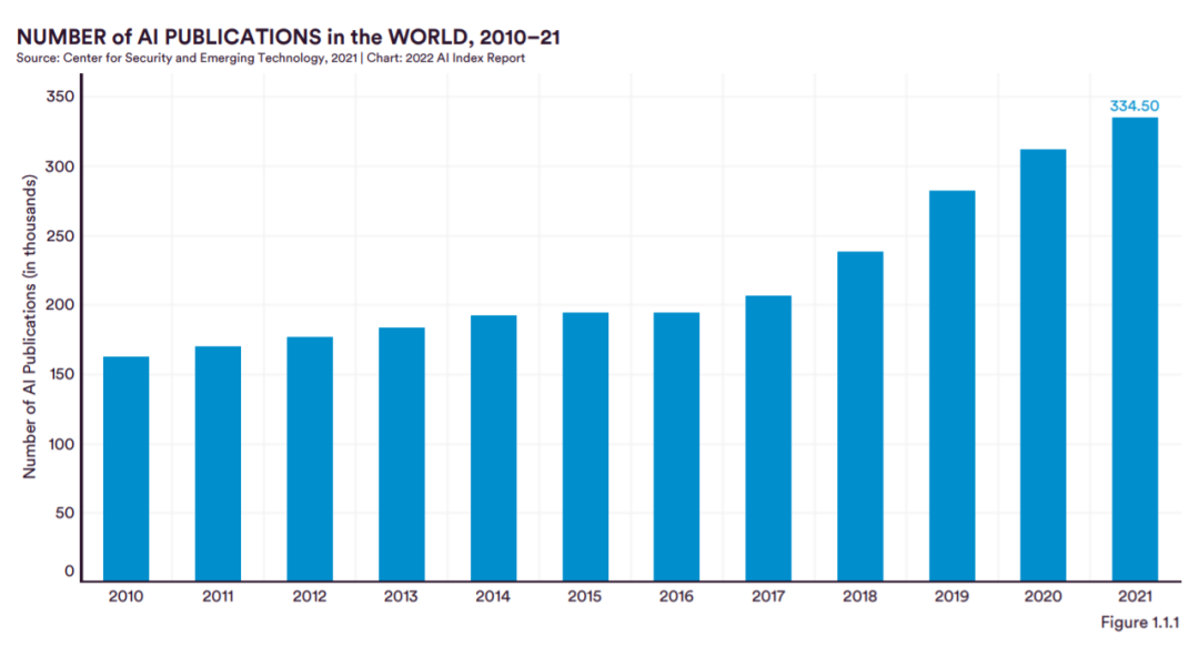 图 1.1.1 为全球 AI 出版物数量。从 2010 年到 2021 年,AI 出版物的总数量翻了一番,从 2010 年的 162444 篇增加到 2021 年的 334497 篇。