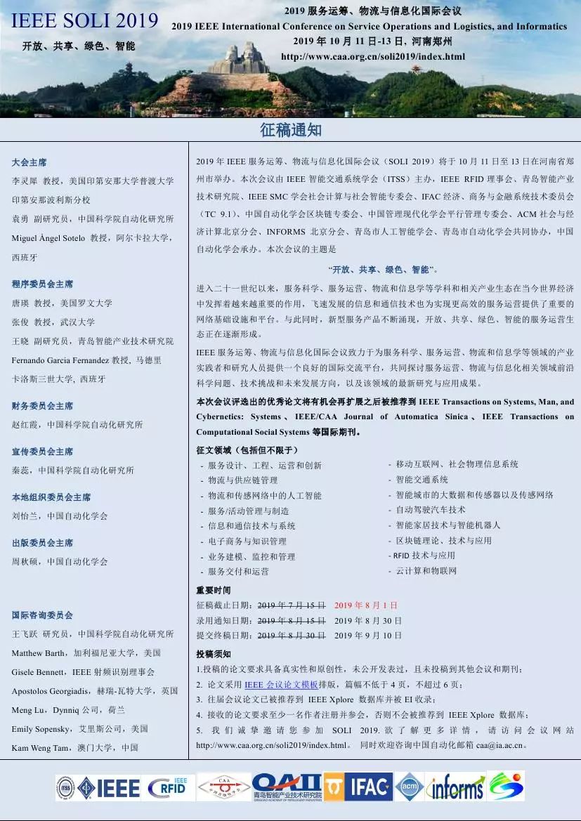 【导读】2019年IEEE服务运筹、物流与信息化国际会议(SOLI 2019)将于2019年10月11日至13日在河南省郑州市举办。应广大作者要求,现征稿截止时间延至2019年8月1日,请各位投稿人周知,欢迎踊跃投稿。