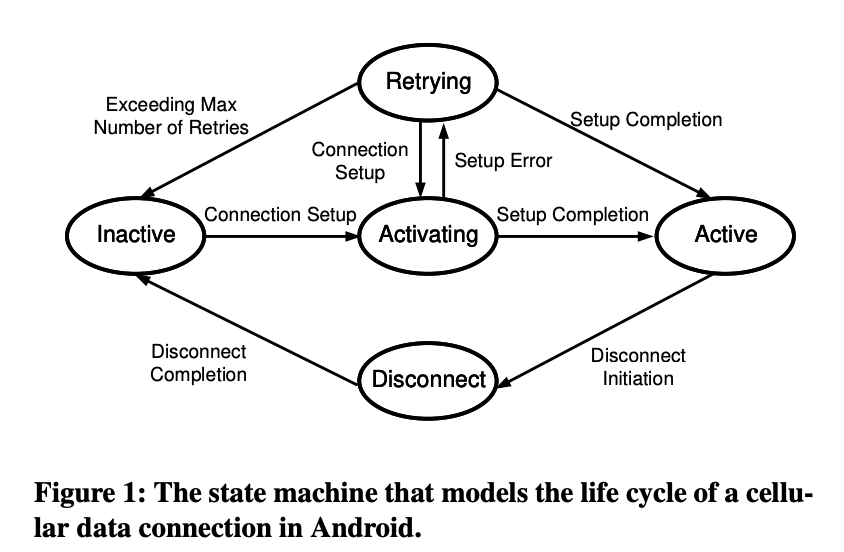 Android中移动蜂窝网络生命周期管理的状态机模型。多种蜂窝数据失败事件发生在不同状态的相互迁移中