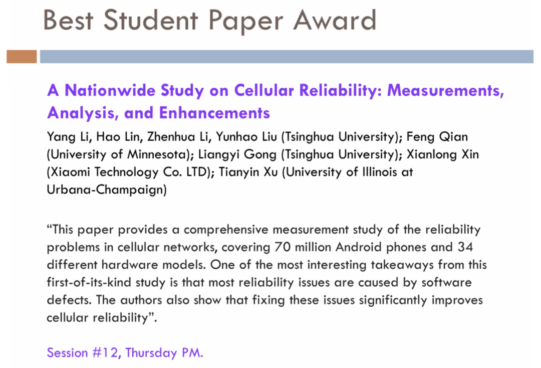 团队的研究论文《蜂窝网络可靠性的全国性研究:测量、分析和增强》(A Nationwide Study on Cellular Reliability: Measurement, Analysis, and Enhancements)获得了唯一的最佳学生论文奖(Best Student Paper Award)。