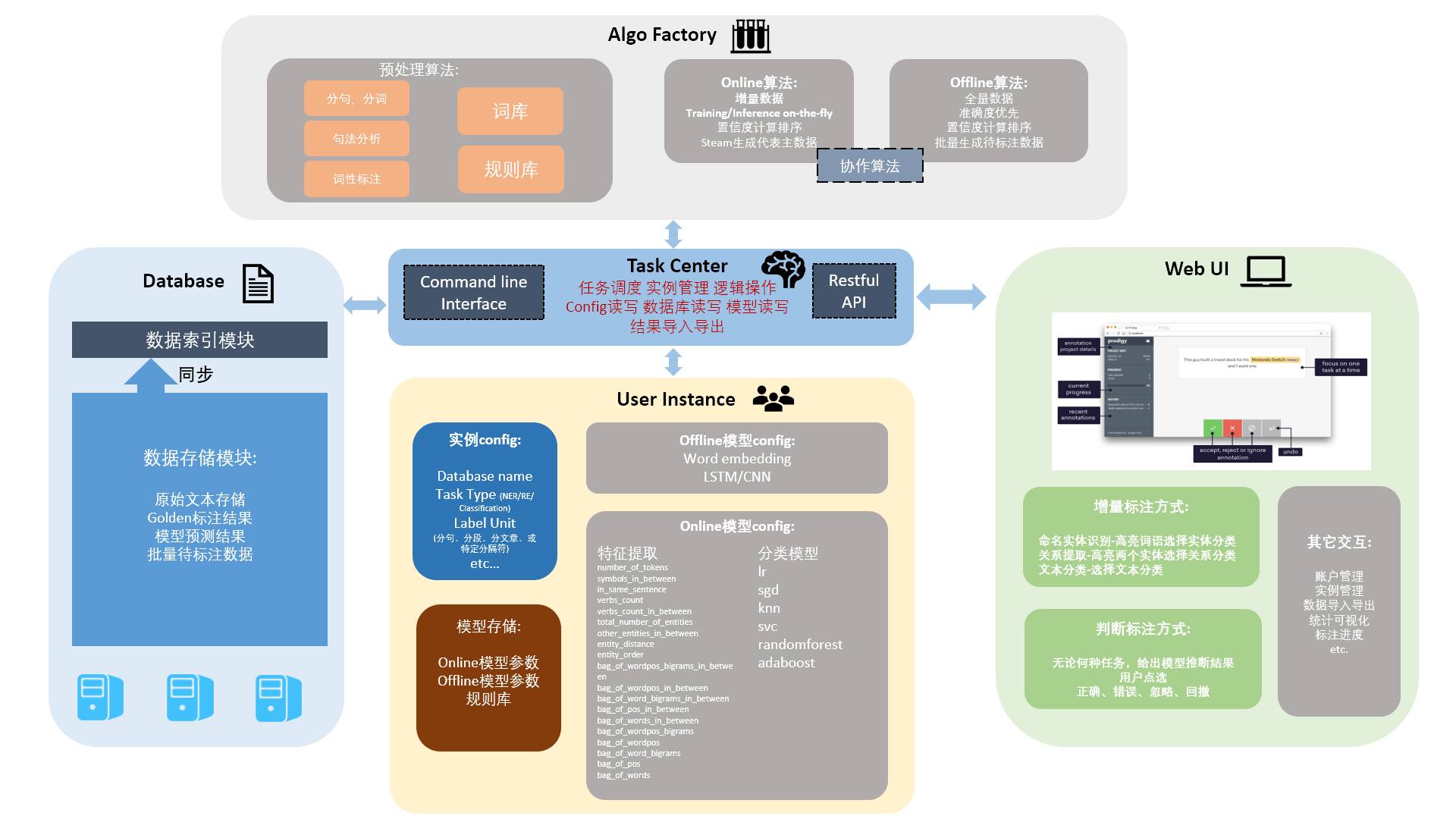 online 与 offline 模型互相协作,与用户手动标注的过程一起不断迭代;在最终标注任务完成之后,offline 模型可以重新在所有标注数据上重新训练,以达到最好的模型效果。