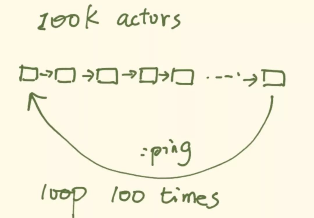 我是这么做的:首先启动 100k 个 processes,每个 process 的入口函数传入上一个 process 的 pid(第一个启动的就放 self()),启动完成后,self 给最后一个 process 发一个最简单的 message,比如 :hello,每个 process 接到 :hello 后,就给它知道的 pid 发 :hello,直到消息回到 self。这样完成一个循环,循环 100 次之后,也就是 10M 次 scheduling,我们计算所花费的时间: