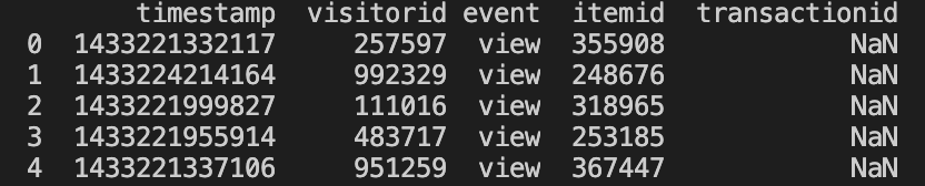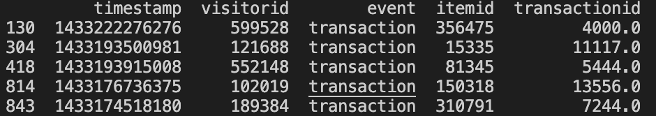 trans = df[df['event'] == 'transaction']trans.shapeprint(trans.head())