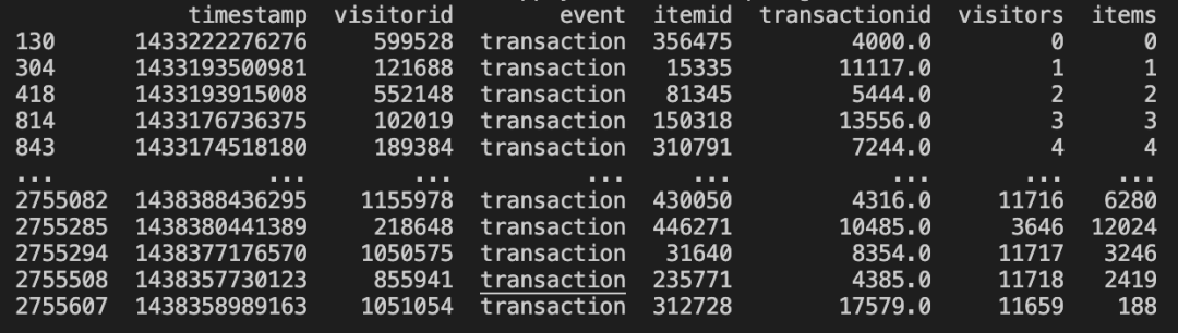 trans2['visitors'] = trans2['visitorid'].apply(lambda x : np.argwhere(visitors == x)[0][0])trans2['items'] = trans2['itemid'].apply(lambda x : np.argwhere(items == x)[0][0])print(trans2)