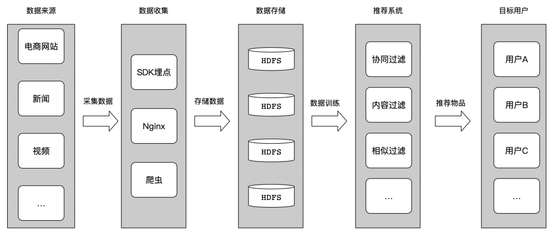 数据来源:负责提供数据来源,比如用户在电商网站、新闻、视频等上的用户行为,作为推荐训练的数据来源;