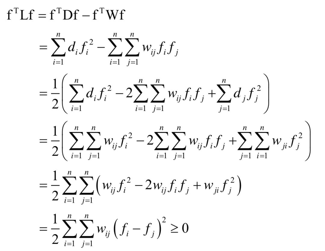 假设L是图的拉普拉斯矩阵,D是加权度对角矩阵,W是邻接矩阵。对于任意不为0的向量f,有: