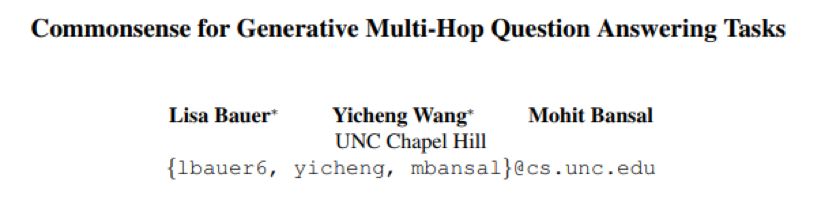 多跳问题一般需要模型可以推理、聚合、同步上下文中不同的信息。就需要理解那些人类通过背景知识可以理解的限制关系。本文提出了一个很强的baseline模型(multi-attention + pointer-generator decoder);引入了一个评分函数评价从ConceptNet知识库中抽取多跳知识(pointwise mutual information + term-frequency );并有效的利用提取的常识信息填补上下文的推理中( selectivelygated attentionmechanism)。