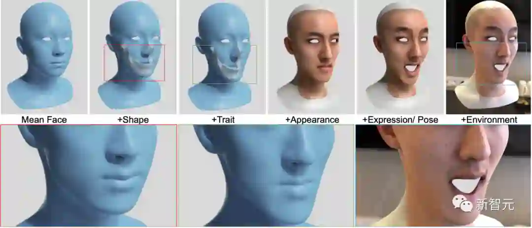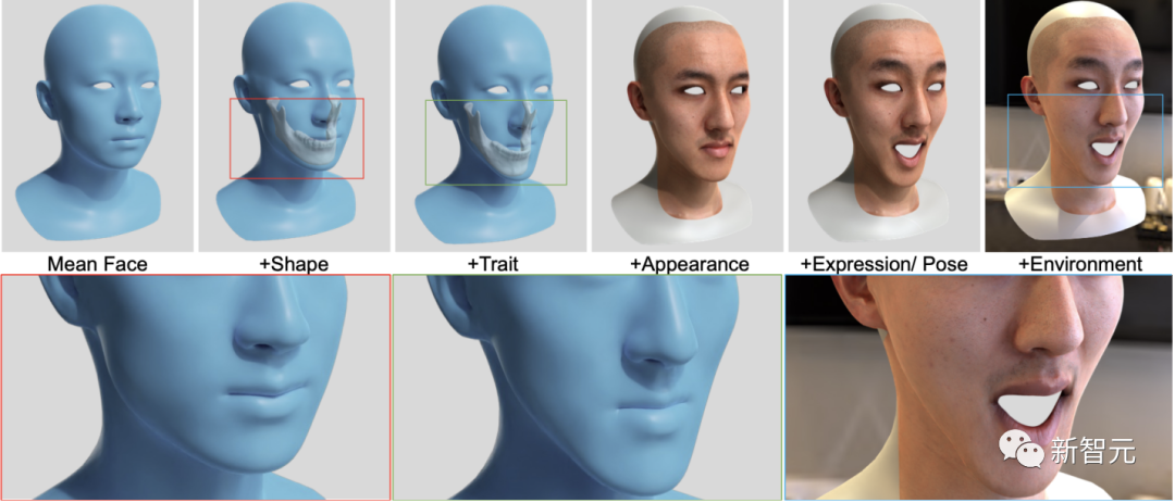 从SCULPTOR的平均模板开始,通过调控形状子空间的系数,使脸部形状发生变化。然后控制特征子空间Trait Component的系数,在局部形状细节上进一步修改模型,为生成的脸部增加更多的特征,如更高的颧骨、更弯曲的下颌,甚至是下颌骨突起。