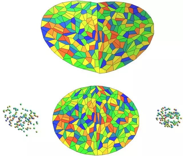 图8显示了几何方法生成的结果:每个胞腔映到一个具有同样颜色数据样本,上包络的面和它的投影胞腔具有同样的颜色。我们可以看到,首先最优传输映射将单位圆盘映射到所有的数据样本;其次,所有的power 胞腔都具有相同的面积,这意味着几何方法完美地生成了经验分布 。我们注意到,Brenier势能函数(上包络)有一个尖脊,将梯度分成了两个团簇,因此能够处理多个团簇的分布逼近问题。