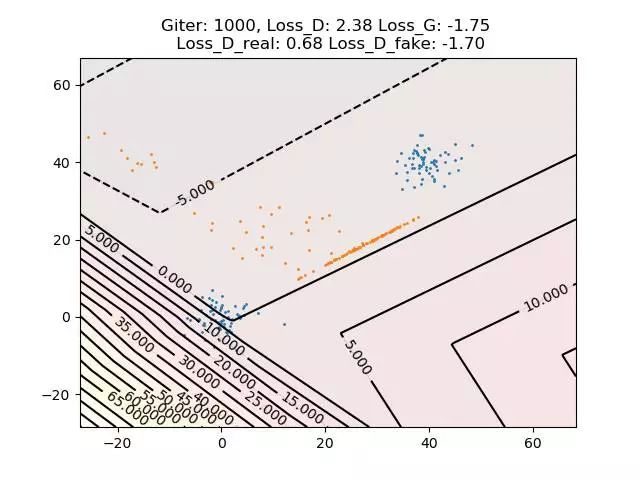 为了可视化计算结果,我们在平面上设计了非常简单的实验,隐空间的概率分布为均匀分布。如图7所示,蓝色点代表数据样本,橙色点代表WGAN生成的样本。数据样本分成两个团簇,符合Gaussain Mixture的分布。我们看到WGAN最后的学习结果并不令人满意,橙色点的分布和蓝色点的分布相距甚远。