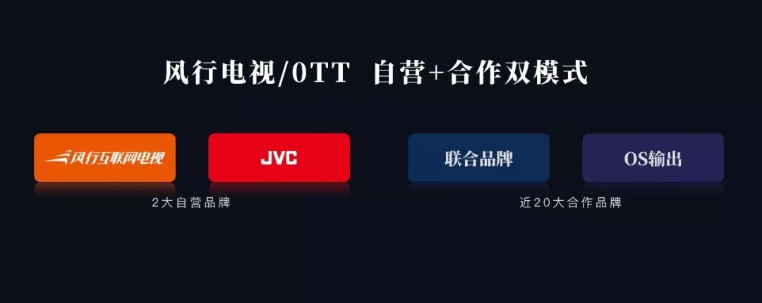 第一个轮子是“自有品牌”,目前主要由风行电视和JVC电视构成。第二个轮子是“OS输出”,将各种品牌电视变成合作渠道和载体,以“FUNUI”系统作为连接器,做内容和商业的深度运营。风行为传统品牌做深度定制,风行的操作系统从出厂时就植入到合作品牌的电视中。另外也与主板厂商合作,将系统灌入主板,再由主板厂商将主板卖给各个电视品牌厂商。