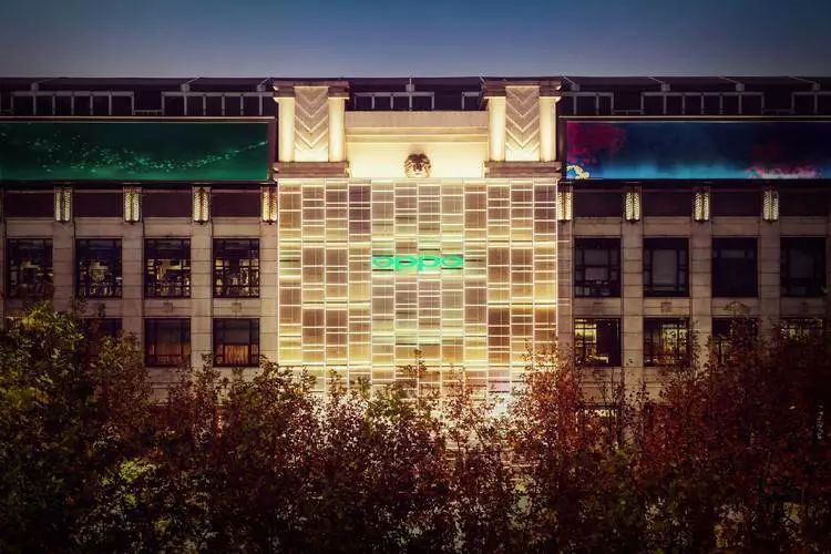 门面正上方大面积的浅金色玻璃墙幕上印着 OPPO 品牌 logo。