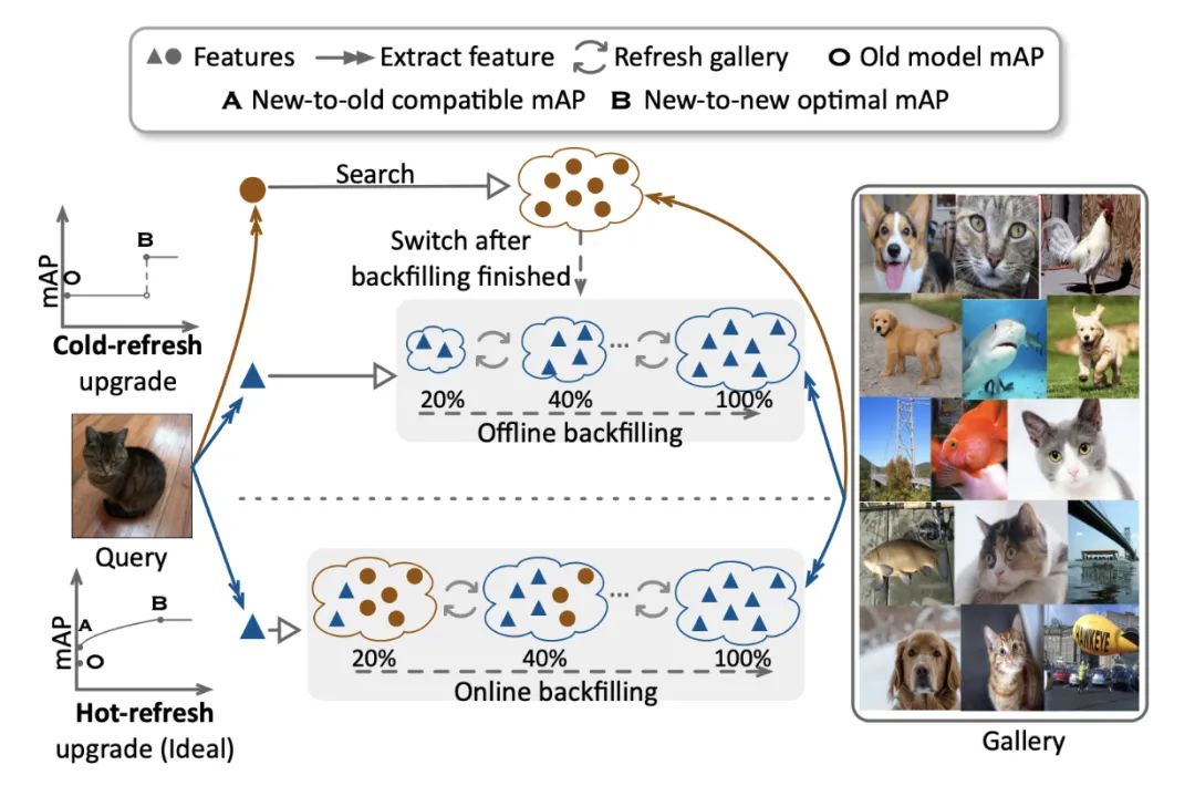 在传统的检索模型升级过程中,需要先用新模型离线刷新底库中的所有特征(称之为特征“回填”),再将新模型部署上线,这一过程被称之 “冷刷新”模型升级。大规模检索系统往往存在海量的底库图像,将其全部离线刷新一遍可能花费数周乃至数月,冷刷新模型升级存在模型迭代的时间成本高、用户体验不能得到即时改善等几大弊端。