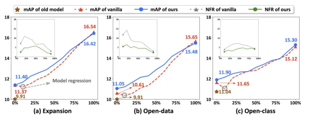 这一正则化看似是对已有兼容损失函数的细微修改,但对于缓解模型退化问题来说起着本质的作用。如下图所示,作者在Google Landmark v2数据集上针对三种不同类型的数据设置(数据拓展、开放数据以及开放类别)进行了实验,均可观察到所提出算法的有效性。同时,作者对热刷新模型升级过程中的负翻转率进行了定义,量化模型退化程度,如图中内嵌小图所示,所提出的算法可有效减少负翻转率。
