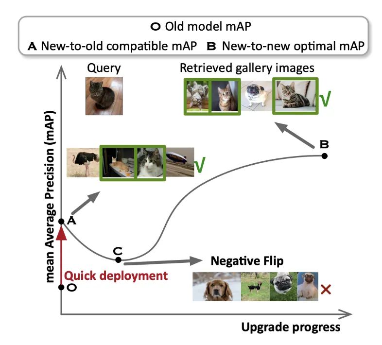 尽管现有的兼容训练算法使得热刷新模型升级成为了可能,但他们均面临刷新过程中的“模型退化”问题,即升级中检索精度的下降,如下图所示(A->C)。