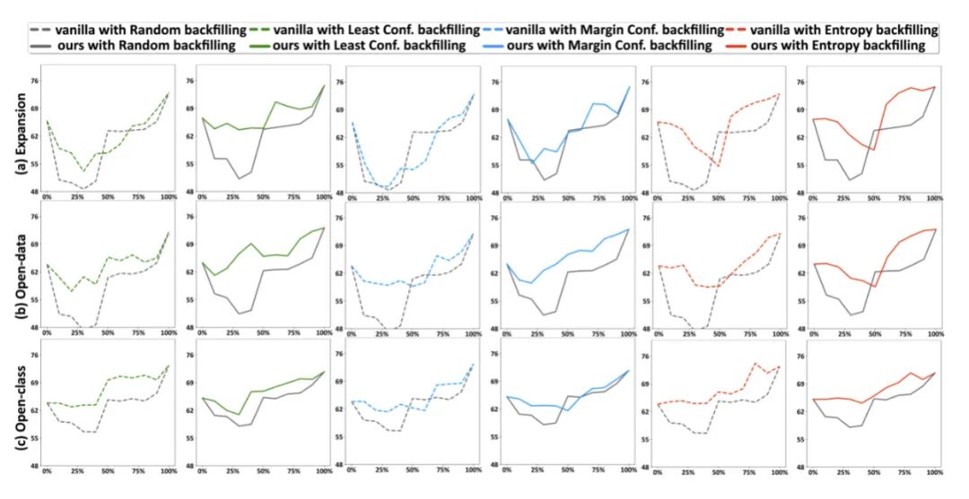 上文提到的损失函数在训练阶段显式地约束新模型减少负翻转的可能性出现,同时作者也提出一种基于不确定性的底库回填策略,可以在热刷新过程中隐式地减少负翻转。该回填策略基于“辨识度差的特征应优先被刷新”的原则,通过轻量快速地估计底库旧特征的分类不确定性,判断特征的可辨识度。如下图所示,作者在Oxford数据集上进行了测试,无论在部署传统兼容训练的新模型(虚线)还是缓解退化兼容训练的新模型(实线)时,基于不确定性的回填策略(彩色)都可以间接减轻模型退化问题并实现精度更快更稳定的提升。