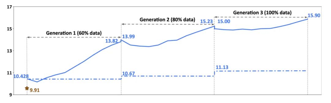 如下图所示,虚线为“无刷新”模型升级,实线为“热刷新”模型升级,从三次模型升级迭代后的精度变化中,可以明显观察出“热刷新”模型升级的优势。大家在图中可能发现,热刷新过程中,模型精度出现了短暂的下降,这也就是下文要继续介绍的“模型退化”(model regression)问题。
