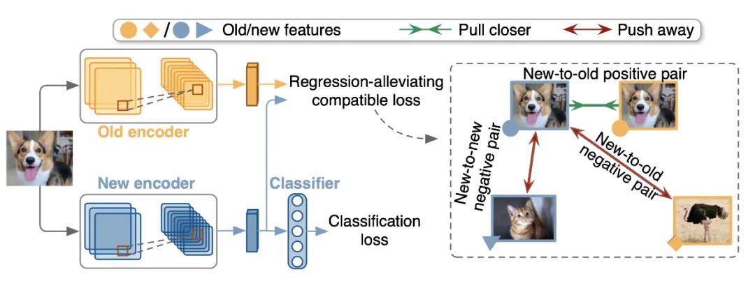 为了缓解热刷新模型升级过程中的模型退化问题,作者提出了一种简单有效的正则化,即约束新->旧正样本对距离不光要小于新->旧负样本对距离,也要小于新->新负样本对距离(过往兼容学习算法只约束了前者),并以对比学习的形式呈现。如下图所示,该正则化被称之为缓解退化的兼容损失函数,具体公式不在此呈现,感兴趣的读者可翻阅论文。