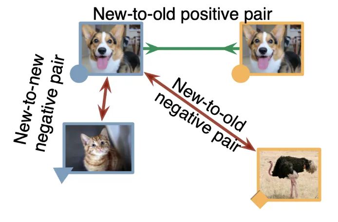 作者发现,这实际上是由升级过程中的负翻转造成,负翻转指的是旧检索系统中可以正确识别的查询图像在热刷新升级过程中被错误识别。而造成负翻转的最主要原因,是在底库特征在线回填过程中,存在新->新负样本对距离小于新->旧正样本对距离的情况,如下图所示。
