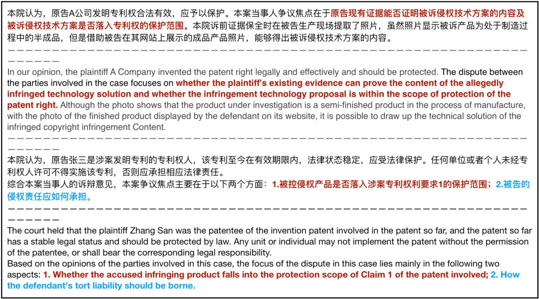 2)分散式的重点信息抽取:在知识产权纠纷案件的裁判文书中,案件的核心是原被告双方争议的焦点。这些信息随着对纠纷的描述不定位置地出现,出现形式也复杂多变,进一步要求模型对处理路径的灵活选择。