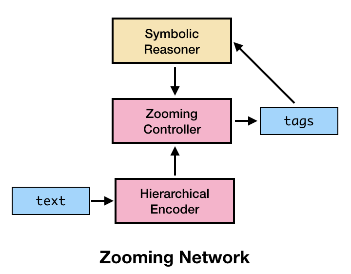 为了更好地利用上述文本特征,我们提出了变焦网络(Zooming Network)的概念。整体上看,变焦网络由三个主要部分组成:层次化编码模块、变焦控制器模块、符号推理模块,分别完成针对语言单元特点的编码过程、解码过程,以及针对自然语言符号化的推理辅助解码。我们将该网络设计应用到长文本序列标注任务上,取得了非常好的效果(f1 score 超过 bi-LSTM-crf 模型 10% 以上)。