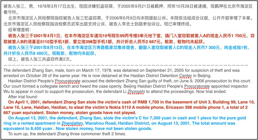1)集中式的重点信息抽取:在刑事案件的裁判文书中,对犯罪行为的具体描述提供了整个案件的判决依据,有很重要的分析价值。这些描述往往集中出现,但是由于整个裁判文书的长度多变,案件复杂程度不一,对这些描述的高效抽取既需要快速地略过无关信息,又需要在信息出现的段落进行精细的分析。