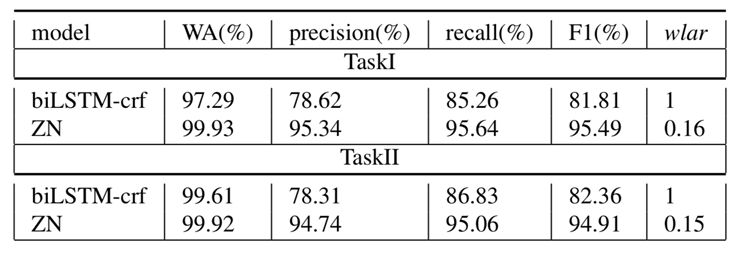 我们使用序列标注经典最优模型 bi-LSTM-crf 作为 baseline model 来比较模型的处理性能,实验结果如下(模型参数数量为同一量级):