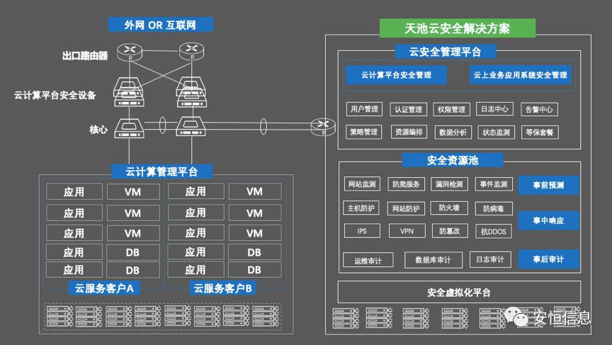 依据等保2.0标准安全框架下 “一个中心 三重防护”的理念,安恒信息推出天池云安全综合解决方案,专为云平台环境及云上业务应用系统提供完整的一站式云安全解决方案,覆盖安全管理中心、安全通信网络、完全区域边界、安全计算环境等安全防护,全方位构建事前预防、事中响应、事后审计的动态安全保障体系。