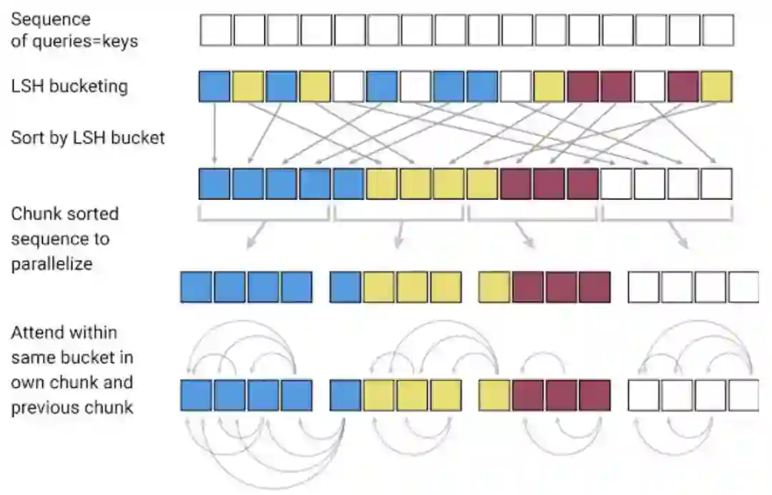 当将 Transformer 模型应用于非常大的文本序列时,第一个挑战是如何处理注意力层。LSH 通过计算一个哈希函数来实现这一点,该哈希函数将类似的向量匹配在一起,而不是搜索所有可能的向量对。例如,在翻译任务中,来自网络第一层的每个向量表示一个单词(在后续层中甚至有更大的上下文),不同语言中相同单词对应的向量可能得到相同的散列。在下面的图中,不同的颜色描绘了不同的哈希,相似的单词有相同的颜色。当哈希值被分配时,序列会被重新排列,将具有相同哈希值的元素放在一起,并被分成片段(或块),以支持并行处理。然后将注意力机制放在这些更短的块(以及它们的相邻块以覆盖溢出)中,从而大大减少了计算负载。