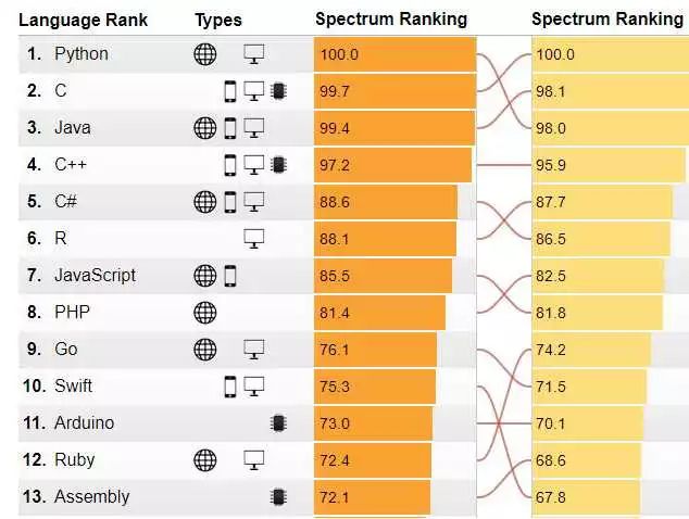 根据IEEE Spectrum研究报告显示,在2016年排名第三的Python在今年已经成为世界上最受欢迎的语言,C和Java分别位居第二和第三位。最近我们报道,Java被斯坦福大学定为入门语言,主要是因为这个编程语言已经“老化”,斯坦福大学不鼓励学生采用CS 106课程,而是用JavaScript代替Java。然而,根据这份报告,Java仍然是招聘者中最受欢迎的技能之一