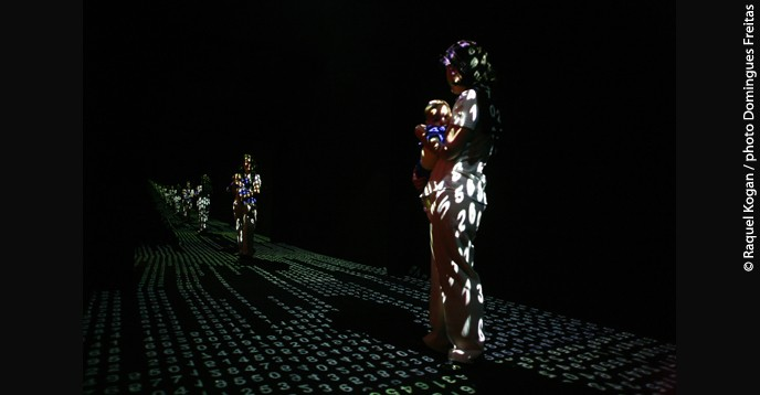 巴西艺术家拉克尔 · 科根(Raquel Kogan)装置艺术作品,计算机生成的数字投射在漆黑的房间,使观众成为了作品的重要组成部分。